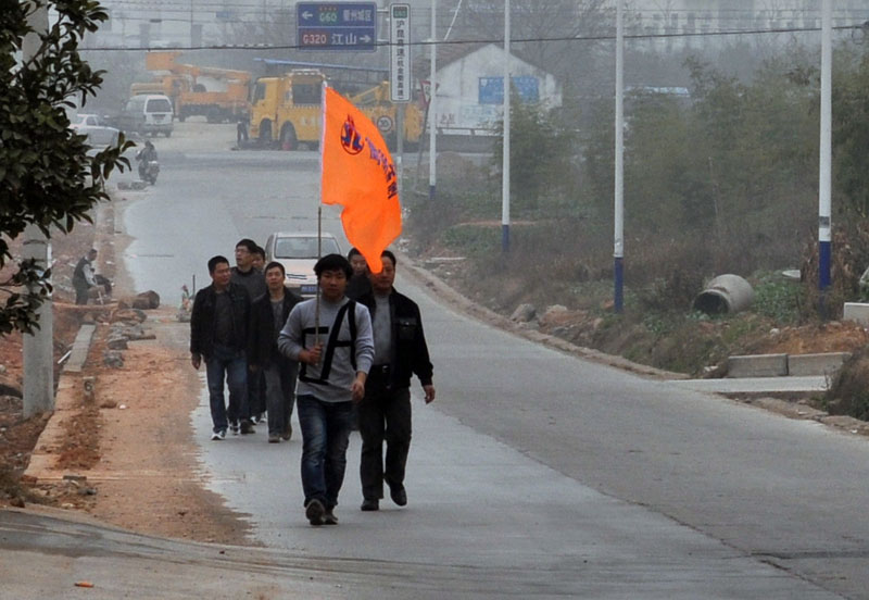 13日早上8點半,簡短的出發(fā)前講話和授旗儀式后,宿州洪河路項目部張慶國一行九人,擎起衢州市政工程有限公司旗幟排著縱隊出發(fā)了,目標30公里。隊員們都穿著輕便的鞋子、衣服,可以看出他們對這次自罰承諾是非常重視,嚴肅而認真的。