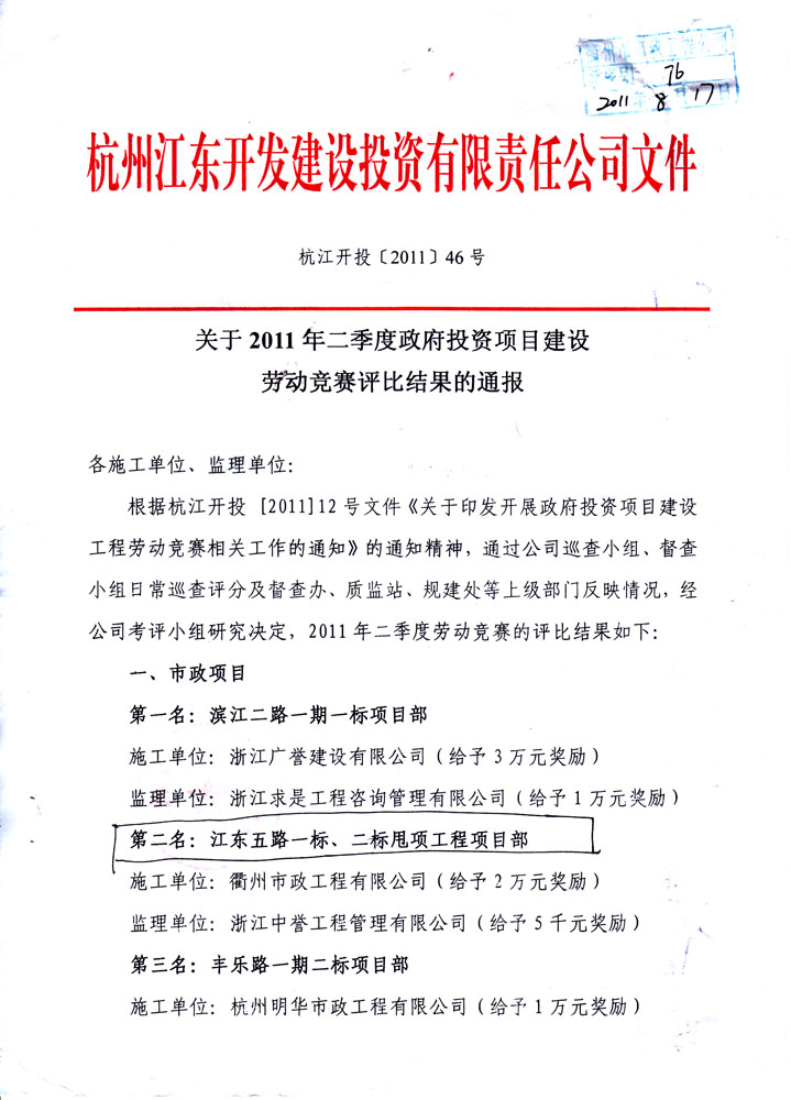 根據(jù)杭州江東開(kāi)發(fā)建設(shè)投資有限責(zé)任公司杭江開(kāi)投[2011]46號(hào)《關(guān)于2011年二季度政府投資項(xiàng)目建設(shè)勞動(dòng)競(jìng)賽評(píng)比結(jié)果的通報(bào)》文件,通過(guò)業(yè)主單位巡查小組、督查小組日常巡查評(píng)分及督查辦、質(zhì)監(jiān)站、規(guī)建處等上級(jí)部門(mén)反映情況,我公司杭州市江東五路一標(biāo)、二標(biāo)甩項(xiàng)工程項(xiàng)目獲2011年二季度勞動(dòng)競(jìng)賽第二名,獲得獎(jiǎng)金2萬(wàn)元。