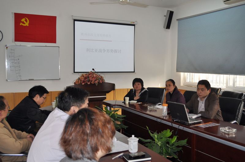 教育以圖片、文字形式,展示了當(dāng)前利比亞戰(zhàn)爭的反復(fù)進(jìn)程,分析了利比亞戰(zhàn)爭的國際和歷史原因,并以本次戰(zhàn)爭為切入點,共同探討了當(dāng)前國際形勢,號召與會黨員要珍惜我國和平穩(wěn)定的國際國內(nèi)環(huán)境,在各自的崗位上努力奮斗,與全國人民一道共同建設(shè)強大祖國。
