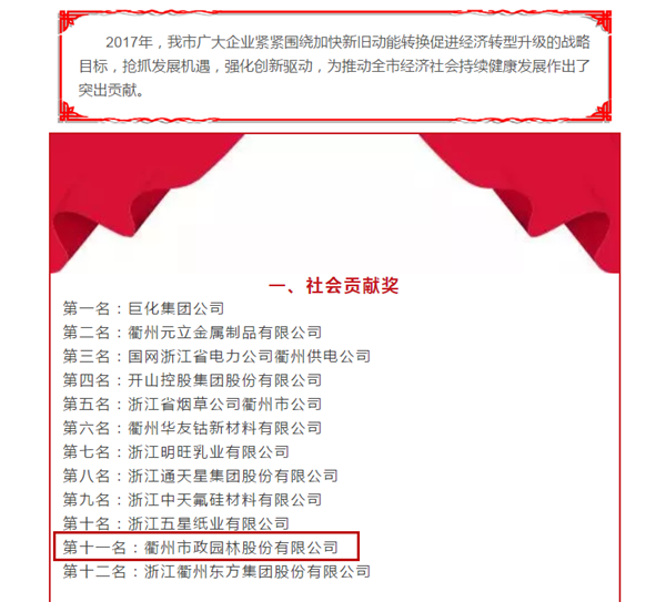 此后一年,我司再接再厲,從公司管理、技術創(chuàng)新以及銷售業(yè)績上都有了進一步的提升。不負眾望,2017年度再次獲得衢州市市長特別獎 -- 社會貢獻獎,也是衢州市建筑業(yè)唯一一家上榜企業(yè)!
