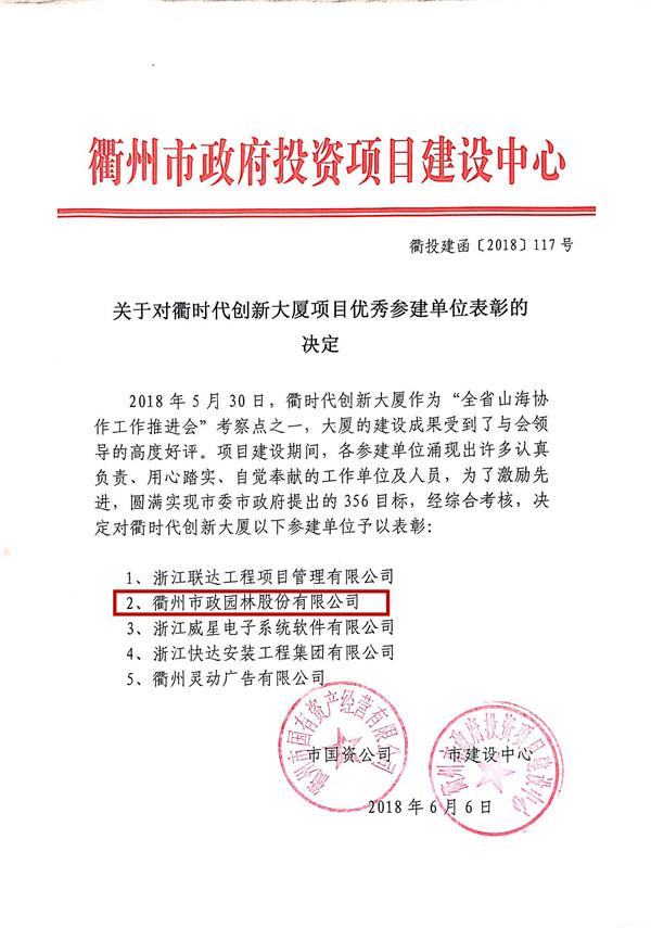 6月6日,衢州市國有資產(chǎn)經(jīng)營有限公司、衢州市政府投資項目建設(shè)中心下發(fā)了關(guān)于對衢時代創(chuàng)新大廈項目優(yōu)秀參建單位表彰的決定文件,我公司作為參建單位受到了表彰。