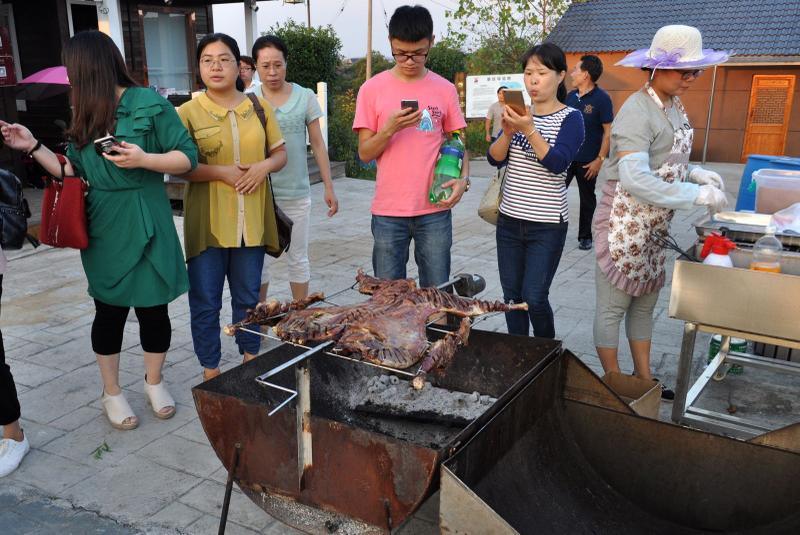 傍晚,夕陽(yáng)西下,涼風(fēng)徐徐,大家在湖邊大壩上進(jìn)行燒烤活動(dòng),特別是烤全羊?qū)Υ蠡镒钣形?。一邊欣賞著美景,一邊品嘗著香氣撲鼻的美食,別說有多愜意了。